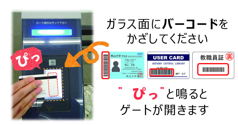- 入館ゲートの読み取り口に、ユーザーカード(学生証・教職員証を含む)のバーコード部分をかざすとゲートが開きます。