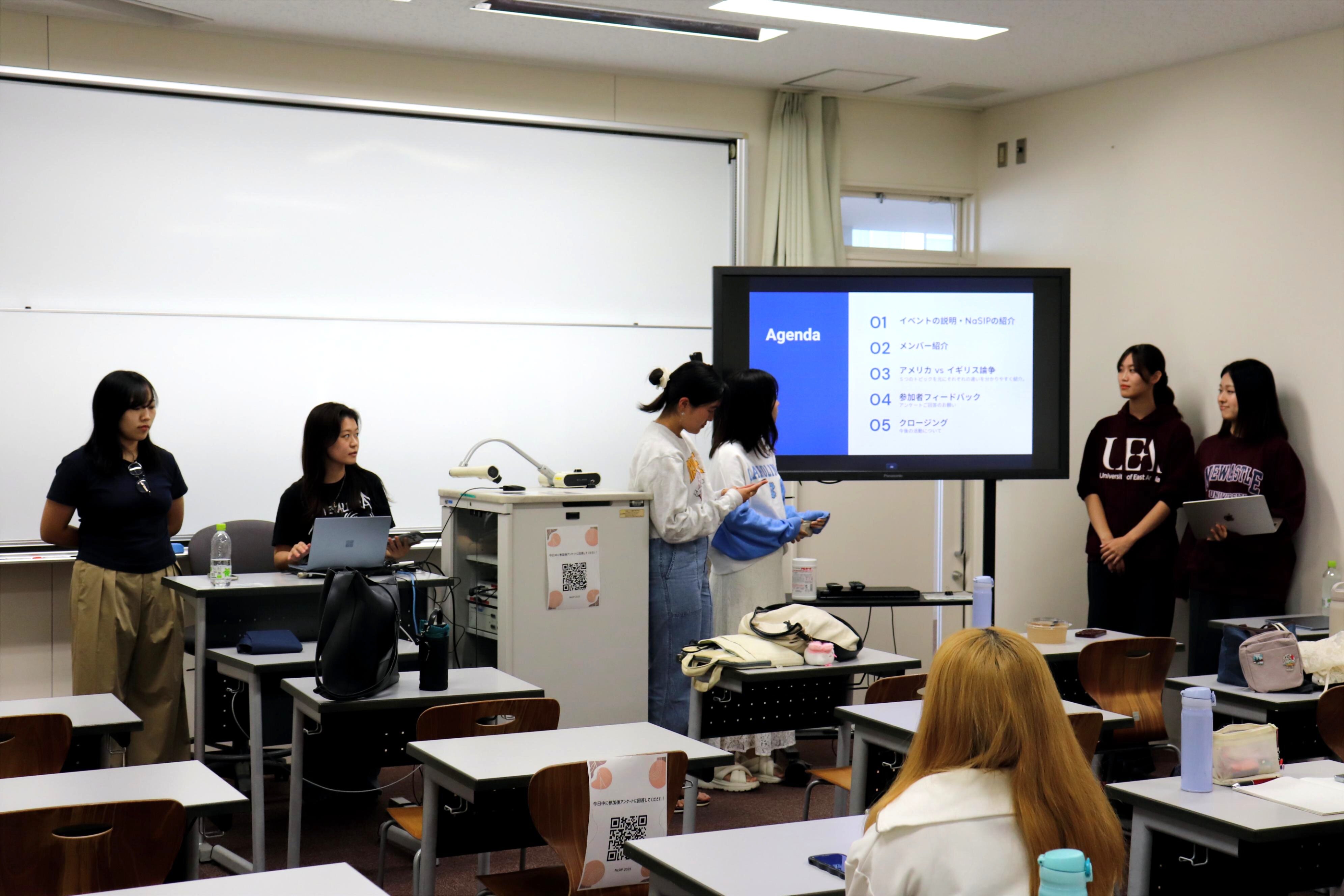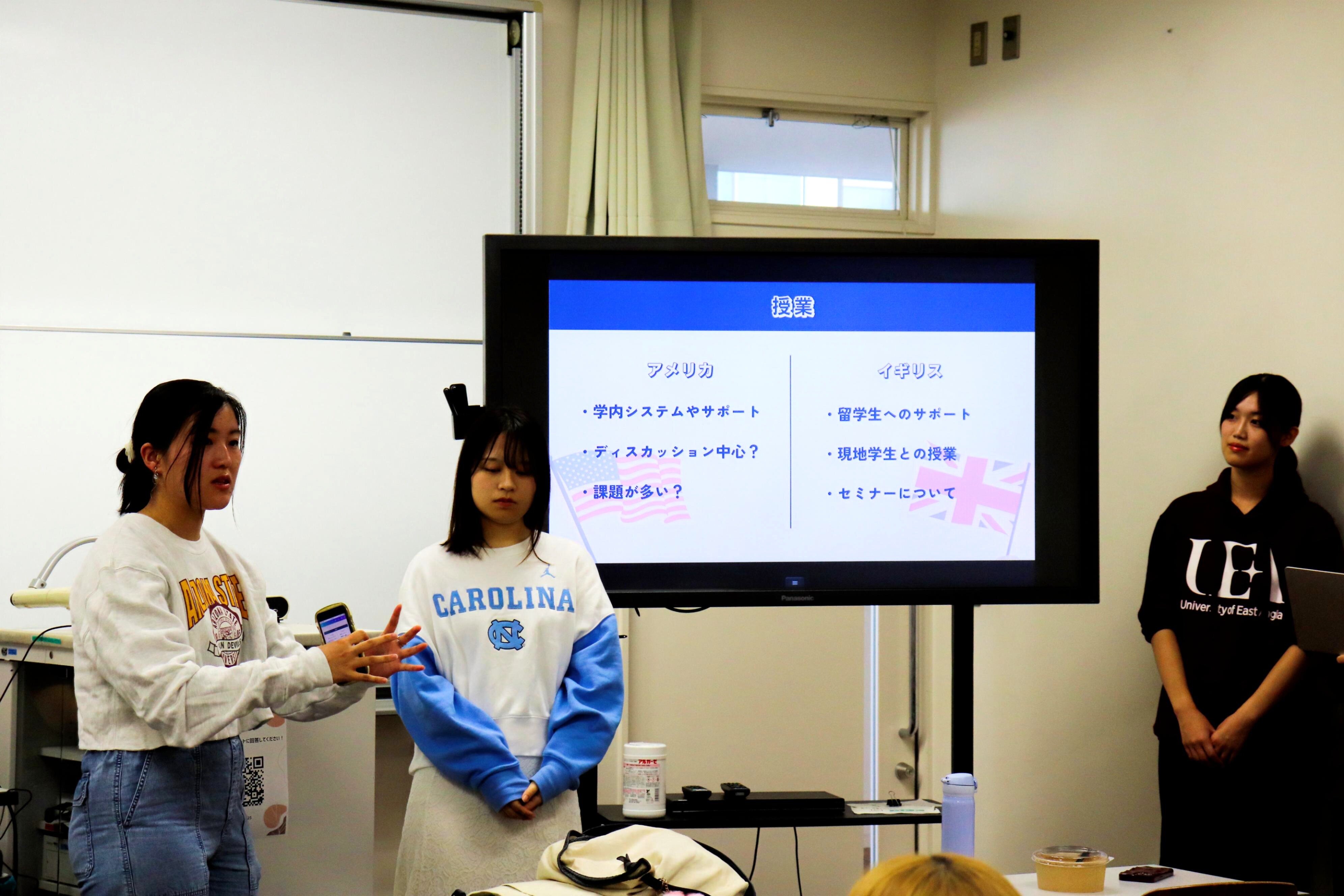 NaSIPメンバーは授業の様子や留学先での友人の作り方、食事など様々なトピックについてアメリカとイギリスの特徴を踏まえて説明を行いました。アメリカは東海岸と西海岸に留学したメンバーが、イギリスは北東部と南東部に留学したメンバーが登壇したことで、両国の違いだけでなく同じ国のなかでも差異があるという気づきもあったのではないかと思います。