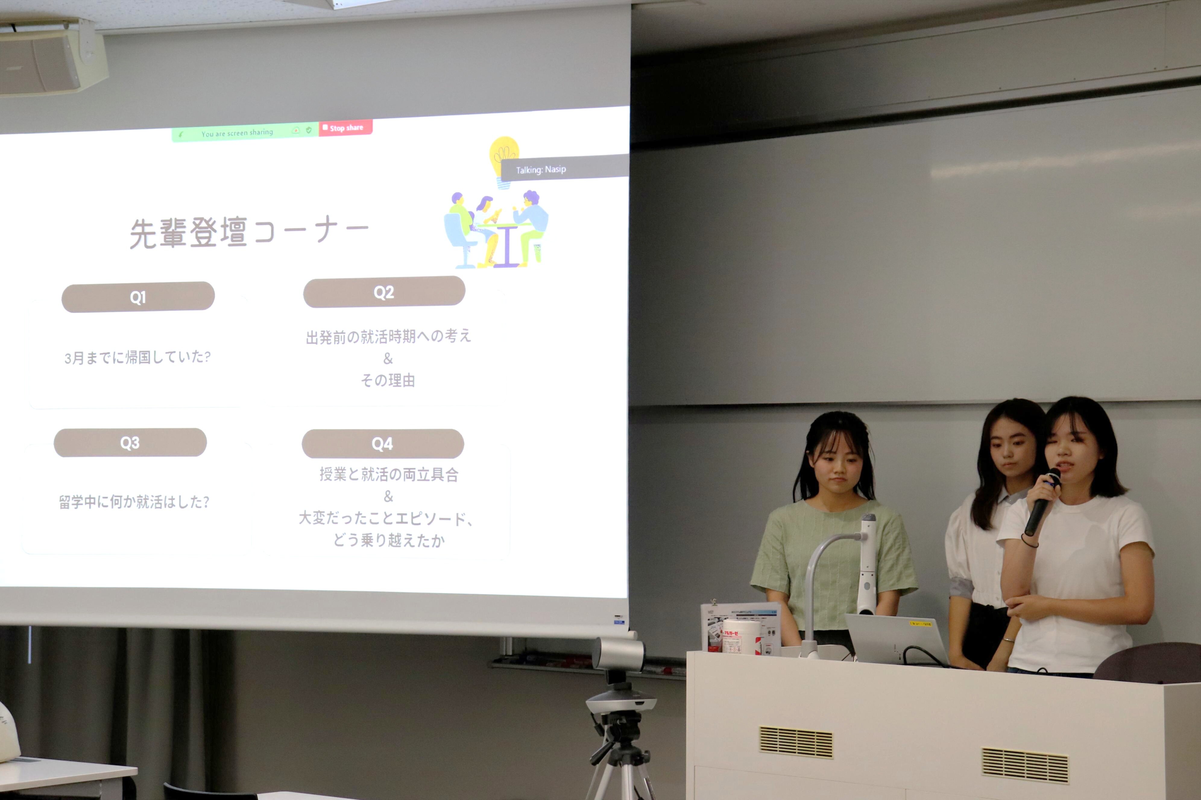 最初にキャリア支援課から就職活動のスケジュールについて説明があった後、留学経験者6名が登壇し、留学前の就職活動への考え方やその準備、留学中に就職活動を両立させるために行ったこと、留学がきっかけで就職活動の軸や自分の将来像の変化があったか、留学経験の自己アピールや"ガクチカ(学生時代に力を入れたこと)"への活かし方などについてトークライブ形式で発表を行いました。