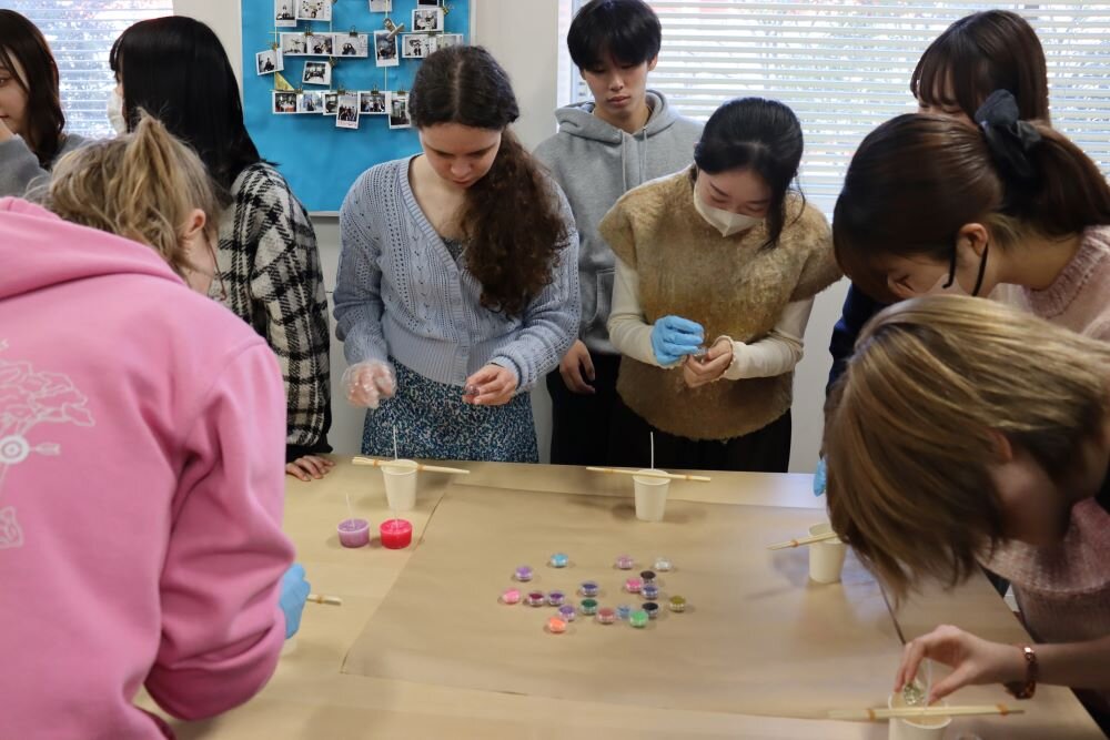 その後のキャンドル作りでは、参加者一人ひとりが染料やアロマオイルを選び、オリジナルのキャンドルを制作しました。色や香りにこだわりながら作業する様子が印象的で、参加者同士の会話も一層深まりました。