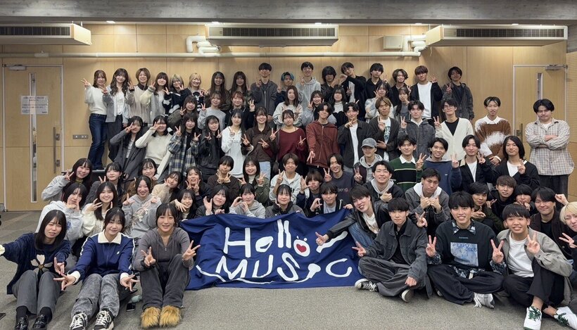 新入生のみなさん、ご入学おめでとうございます!私たち、Hello MUSIC(略してはろみゅ)は班制度でバンドを組み、通年の活動をしています。同学年だけでなく、色々な人と関わりが持てるので、先輩後輩関係なく、みんな仲良しな部活です。大学から楽器を始めた人も多いので、これから始めたいという人も大歓迎です!班には必ず経験者の先輩がいるので、わからないことは優しく教えてもらえます。また、班以外の活動として、個々でバンドを組んで行う有志ライブ、他団体と行う合同ライブがあります!わたしたちと一緒に楽しく音楽しましょう!お待ちしています。