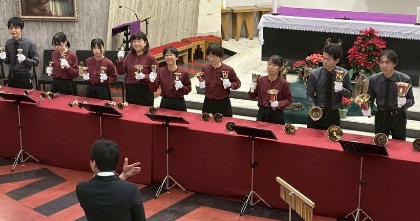 こんにちは!ハンドベルクワイアです。私たちは社会人チーム「Handbell Company 一音」と合同で、中部フェスティバルなどの大会やコンサートに向けて、日々練習に励んでいます。昨年度は、国内外での様々な活動へ参加しながら、12月には神言神学院にて自主コンサートを開催しました。